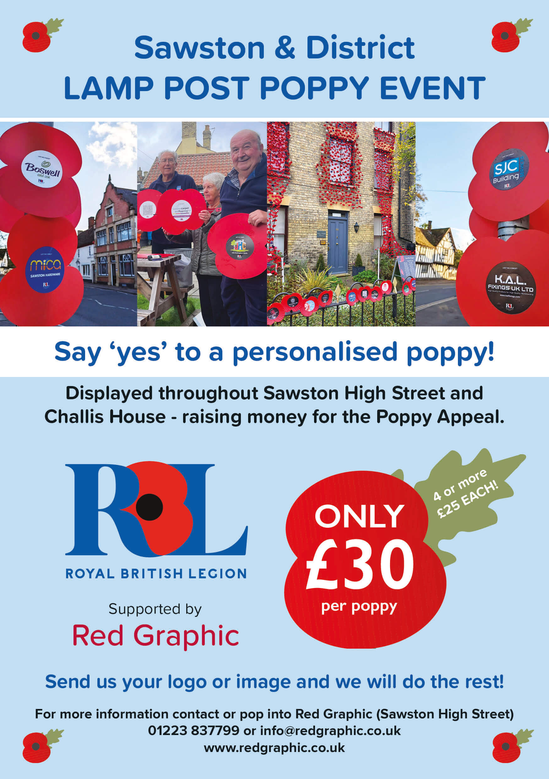 ONLY £30 per poppy 4 or more £25 EACH! Displayed throughout Sawston, Duxford & Pampisford High Street and Challis House – raising money for the Poppy Appeal.